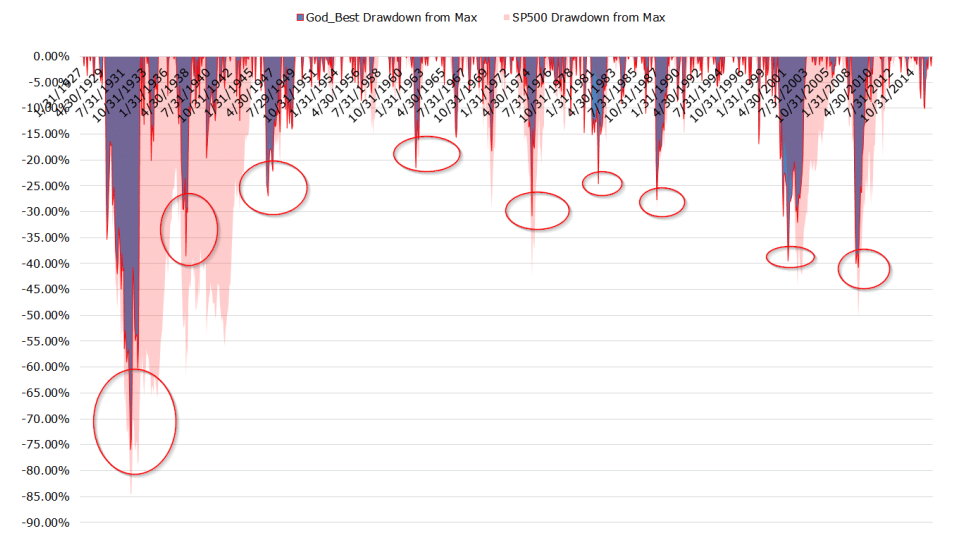 Ed è proprio qui che lo studio di Wesley Gray colpisce più duramente: non tanto sui rendimenti, ma sulla profondità del dolore (drawdown) che anche una strategia perfetta può infliggere. Il portafoglio God_Best – costruito con preveggenza perfetta sui migliori titoli dei successivi 5 anni – subisce un drawdown massimo del -75,94%, in particolare tra agosto 1929 e maggio 1932, cioè durante il crollo della Grande Depressione.