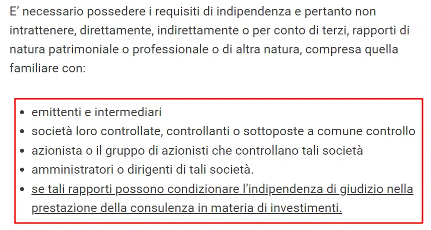 in sostanza non devi avere rapporti di alcun tipo con intermediari, emittenti e con altri soggetti che trovi nell’immagine seguente, se tali rapporti possono condizionare l’indipendenza di giudizio nella prestazione della consulenza in materia di investimenti.